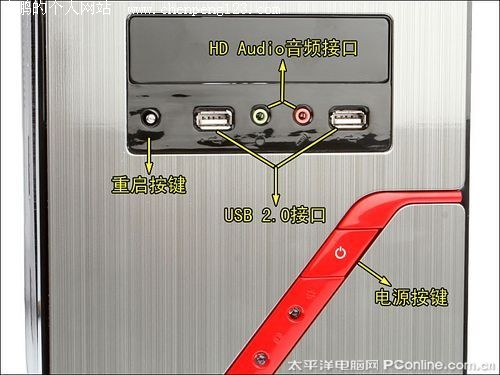 技展 彩钢八号机箱的前置接口及重启按键设置在前面板中部,提供了2组USB2.0接口和HD Audio音频接口,电源按键则被单独设计在前面板的红色条纹上。