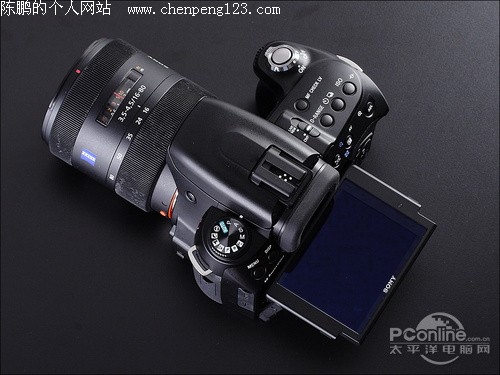 索尼A550机身顶部,可以看到屏幕处于向上折叠状态