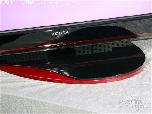 55FT68整体给人的感觉是高贵大气,黑亮光滑的机身外壳,红色的底置伴音音箱狭窄修长,外面还覆盖一层透明有机玻璃。椭圆形底座也是红、黑两色结合,和上面的音箱设计相呼应。