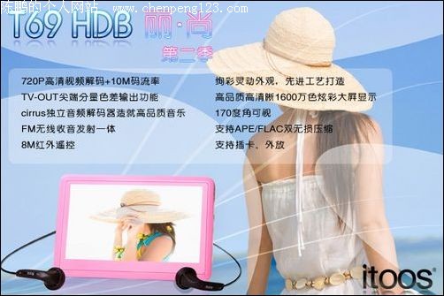 功能方面,itoos T69HDB采用CC1600芯片,支持RMVB/RM、AVI、FLV等主流的视频格式播放,支持视频最大分辨率为1280×720、10M流码,支持色差分量视频输出,可通过高清设备终端,获得更为强烈的视觉感。音频方面,itoos T69HDB采用了专业的cirrus独立音频解码器,支持mp3、wma、ape、flac音频格式,音质效果中音十分清脆,高低音表现一般。其他方面,该机支持图片浏览,视听同步,电子书签翻阅,天籁休闲伴读。声色并茂,文艺兼备。