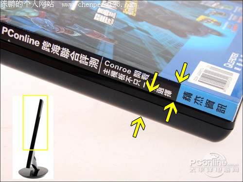由于采用了LED背光,产品侧面十分纤薄,最薄处仅为19mm。上图为LG W246L和主流杂志的厚度对比。
