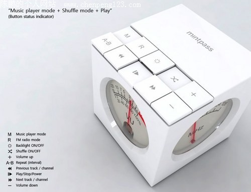THE CUBE的机身被设计为一个2英寸边长的立方体,机身顶部设计了十个按键供用户操作。其中包括播放、FM收音机、背光灯选择、播放模式选择、音量调节、A-B复读等按键。