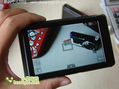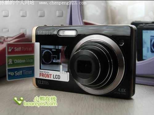三星出品的ST550的最大卖点,就是除了其机身背部配置了常规的屏幕外,还在机身正面面板提供了一块1.5寸取景显示屏,专门用于自拍时使用。