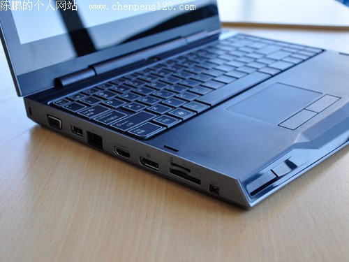 操控区域,虽然键盘手感中规中矩,但是可变化颜色的键盘背光灯确实成为了整机的亮点。遗憾的是触摸板附近没有采用背光式设计。此外我们看到由于机身尺寸较小,所以键盘区域并没有设置更多快捷键。