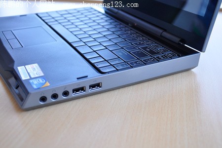戴尔Alienware M11x虽然只有11.6英寸机身,却为用户提供了丰富的接口种类,机身右侧有麦克风/音频接口和两个USB接口。由于这款机器并没有配备光驱,右侧机身空间布局局部稍显局促。