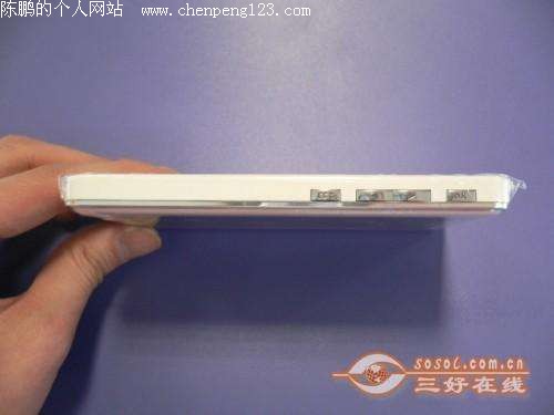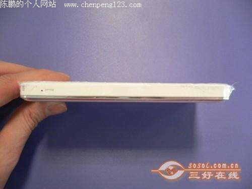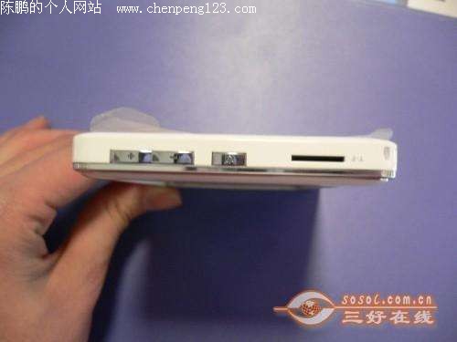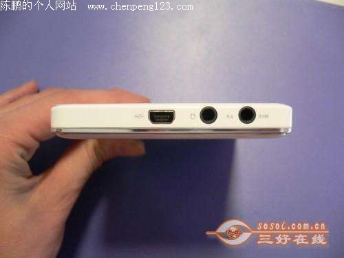 蓝魔 T17FHD将接口依然设计在了机身的侧面,包括MIC孔、TV-OUT孔、耳机插孔和USB插孔等一个都不少。机身的背部则依然采用了珠光白的钢琴烤漆材质,晶莹剔透握在手里光滑圆润。右下角设有一个外置扬声器,音频文件可以与周围的朋友一同分享。