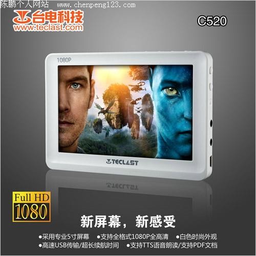 台电C520采用自主参与研制的T8100主控处理器,能播放1080P(1920*1080)分辨率高清视频,兼容VC-1、MKV、TS三大高清编码格式,支持AVI、RM、RMVB、3GP、DAT、FLV、MP4、MPG、VOB、MKV、MOV等视频格式。台电C520支持TXT、PDF格式电子书,并内置TTS文本朗读功能,多种语言/方言声音输出,满足不同用户的需要。