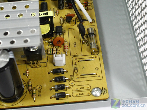 下面登场的这款海鑫380W同样也是一款典型的山寨电源,电源内部用料虽然干净整洁,但是放眼整个PCB板却又是一片雷人的“不毛之地”。