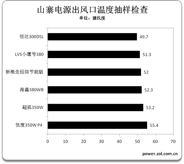 由于测试过程中功率负载仪势必会产生一定的噪音,我们无法通过噪音仪来直接测试这些山寨电源的噪音值。不过考虑到电源噪音主要源于风扇转速,风扇转速越快噪音就越大,我们将通过风扇转速和出风口的温度来综合考量静音效果。