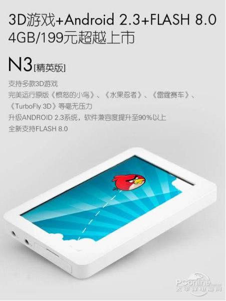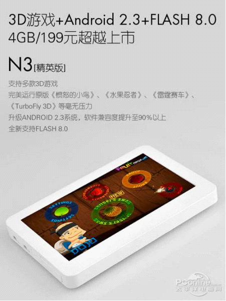 N3精英版采用和N3相同的硬件架构,并将系统升级至ANDROID 2.3版本,同时利用软件优化将3D图形性能释放到极致,可以极流畅的运行多款3D游戏。更为重要的是,N3精英版将价位进一步拉低,仅售4GB/199元,已经和目前市面中最便宜的MP4售价保持一致。