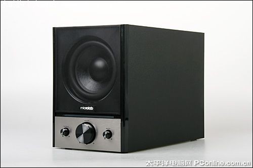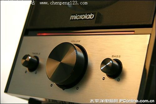 低音箱前面板上具有一个大大的主音量调节旋钮和一组较小的高低音调节旋钮。这三个调节旋钮操作手感都相当顺滑,位置也很便于用户触摸。
