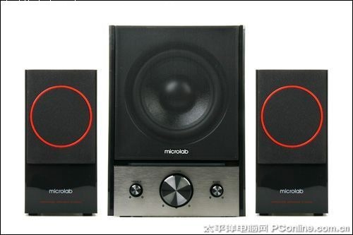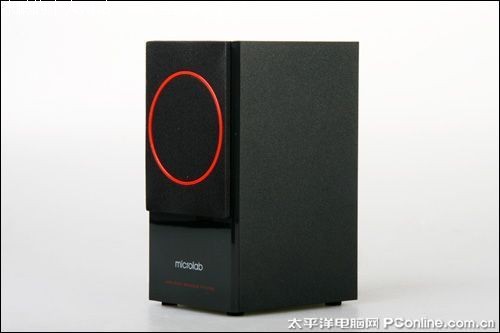 两只卫星音箱也是麦博 梵高FC330十周年纪念版的又一大看点。卫星音箱采用了木质箱体,体积比较大,箱体形状也比较规则,前面板上大大的红色装饰圆环也为音箱带来了一股动感、活泼气氛。