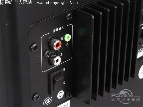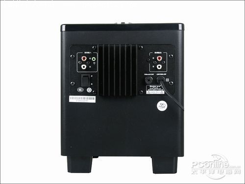 音箱具备3.5mm + RCA两组信号输入接口,更便于用户使用。信号输出接口也采用了RCA设计,接口旁边的文字标注的简洁清晰。低音箱后部具有大面积散热片,用以辅助内部功放电路散热。