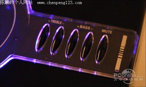 低音箱顶部还具有一组高、低音调节按键和一个静音按键,功能比较全面。但受限于箱体顶部的面积,这些功能按键设计的都比较细小,用户在使用中需要先观察、再操作。但好在2.1音箱的高、低音增益一旦设定好,就很少需要再进行频繁的调校,用户真正需要经常用到的还是主音量调节旋钮。