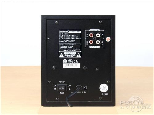 低音箱右侧面仅具备一个电源开关和一组输入输出接口。由于音箱集成了播放控制按键,还附带了红外线遥控器,因此箱体上并不具备传统的增益调节旋钮。