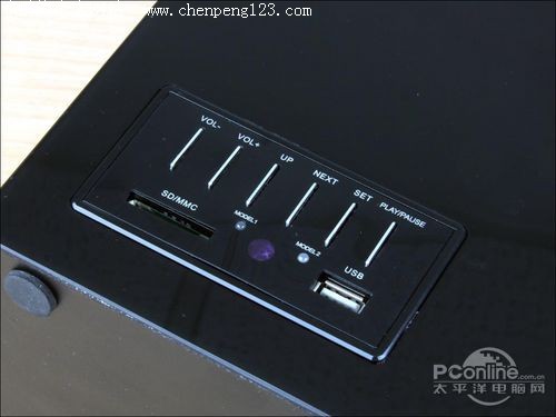 在我们的印象中,音箱应该是一个很“被动”的PC组件,它自己并不能独立工作,其功能就像是PC的“传话筒”一样传达声音。但是在看到兰欣 V-58052.1音箱之后,我们可能要改变一下这种看法了。兰欣 V-5805音箱前面板的显著位置上设计有U盘/SD卡插槽,可以对插入的U盘/SD卡内的多种格式音频文件直接进行解码播放。这就相当于把MP3播放器的功能集成到了音箱之中,使音箱可以脱离PC独立运行,在一些场合下可以为用户带来不小的便利。