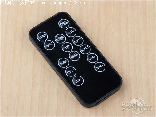 音箱附带了一只超薄红外线遥控器,遥控器功能比较丰富,能够大大简化用户的操作,使这款数码音箱更具“家电”元素。