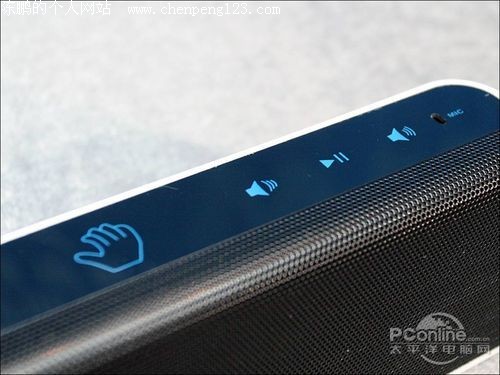 箱体顶部按键具有一排触控式操作按键。下图中,左侧第一个小手状按键,是“指令下达同步按键”。右侧的三个按键,则分别对应“降低音量”、“播放/暂停”、“增加音量”等控制功能。上图最右侧的一个小孔,就是这款声控音箱的麦克风,用于接收用户发出的语音指令。
