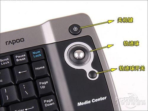 雷柏 2600多媒体遥控键盘给人第一感觉就是带有丰富的多媒体控制设计,左侧有7个快捷键和一个滚轮(相当于鼠标滚轮的功能),顶部8个快捷键,右侧是轨迹球、关机键及轨迹球开关。另外,更有意思的是,代替鼠标左右键的两个按键隐藏在键盘左上和右上两个角上,下文我们将详细介绍。