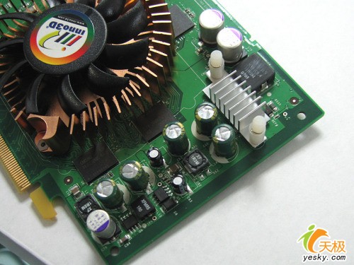 核心和显存采用了分离供电,供电部分用料毫不马虎,采用了高品质的日系红宝石和KZG电容,而散热风扇吹出的风正对供电电路,能起到良好的辅助散热效果。铭瑄为这款显卡配备了一个厚实的涡轮散热器,里面密密麻麻的鳍片高度足有2CM,能提供了很好的散热效果。PCB上集成的智能核心控制芯片,当风扇因外界影响而停转的话,显卡就会发出声音报警;如果继续运行,当核心温度超过预设的范围时监控大师就会提示;继续操作的话,监控大师就会自动关机保护显卡。