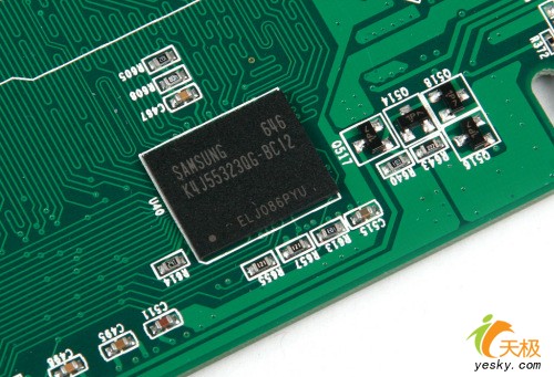 显存方面,富彩7600GS魔龙版采用的是韩国三星公司生产的高速1.2ns GDDR3显存,正面一共采用了4颗,组成了128M、128bit的显存规格。富彩7600GS魔龙版的默认核心、显存频率分别为560、1300MHz,与公版7600GS相比,其默认核心频率要比公版7600GS高出160MHz,而默认显存频率要比公版7600GS高500MHz,显存容量则是公版7600GS的一半。由于1300MHz的显存运行频率尚未达到1.2ns显存颗粒的理论最大运行频率,故这款富彩7600GS魔龙版在显存方面还存在一定的超频空间。