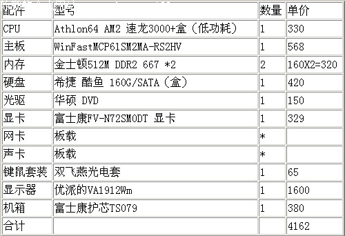 物价涨,股票涨,房子涨,等等,都在涨。整个IT市场也不甘示弱,借着开学的劲也开始了涨。不过,涨归涨,眼看着新生都入学了,开学买电脑也是必不可少的。所以,即使再涨,为了孩子,许多家长还是咬牙,新的电脑是一定要配的。下面则是使用富士康 FV-N72SM0DT显卡配置仅4000多点的PC清单: