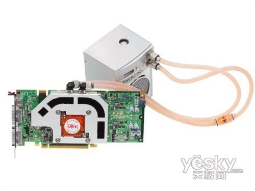 与其它8800GT唯一不同是七彩虹为其搭配了一体式液冷散热器,该液冷散热系统是全球顶尖散热厂商EVERCOOL给七彩虹OEM的产品。在GPU的核心散热部分特采用目前最先进的冷锻工艺,三棱形鳍片能够在与导热液保持充分接触的前提下,保持更小的液体阻力,提高液体流动速度,同时所有接触度采用21K镀金镜面工艺,能够应用散热效果更好的有机液冷剂。