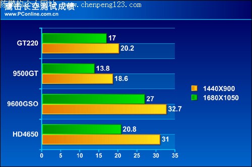 鹰击长空是一款支持DX10.1模式的游戏,在这款游戏中我们看到具备DX10.1特效的GT220显卡要领先9500GT,而同样具备DX10.1特效的HD4650则要领先这两张显卡。
