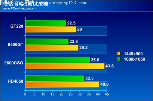 在《使命召唤5》中GT220与9500GT的成绩还是延续了之前两个测试项目的走势,保持在同一水平上。与对手HD4650相比在这个游戏中还是有比较明显的弱势。