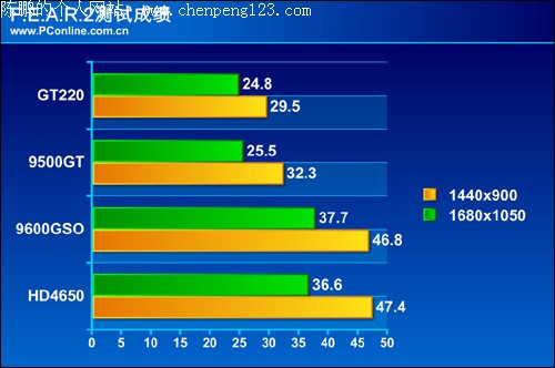 游戏《F.E.A.R.2》是一款对AMD显卡优化比较明显的游戏,因此在这款游戏的测试成绩中我们看到HD4650的成绩甚至要高过9600GSO。在这款游戏中GT220的成绩与9500GT的成绩基本还是出于不相上下的水平。