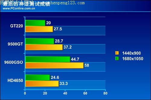 在这款对现存要求不是很高的游戏中9500GT得到比较好的发挥,从上面的测试成绩中我们看到9500GT的成绩要领先HD4650,而GT220则要落后HD4650。