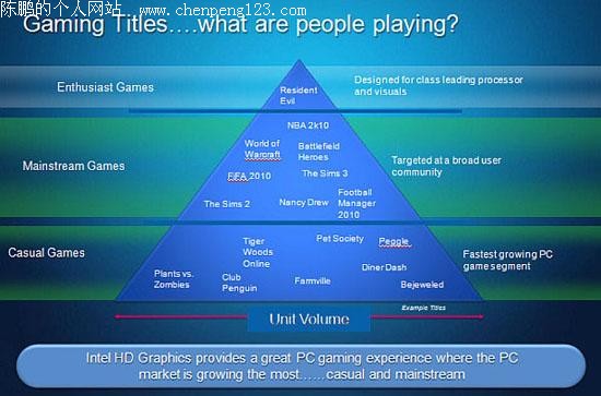 在Intel看来,不管整合图形芯片是像原来一样内建在主板北桥芯片里,还是像现在一样被处理器说集成,它都是免费提供给用户的。当然,Intel也不会因为它是免费的就完全不看重它的3D性能。随着新的GMA HD芯片的发布,Intel也给出了它的游戏性能宣传文档,用金字塔的形状展示了其可以运行的游戏列表,其中就包括流行的魔兽世界甚至是生化危机5。不过在我们看来,这份没有给出分辨率和画质设定的宣传文档并没有什么意义。