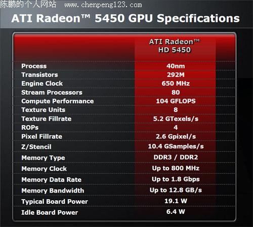 ATI Radeon HD 5450显卡(Cedar核心)的流处理器数量、纹理单元数量以及光栅单元数量分别是80个、8个和4个,650MHz的核心时钟频率可以提供104GFLOPs的单精度浮点运算量。搭载64-bit显存界面,最多可以支持1GB容量的DDR3/DDR2内存。空载和满载功耗分别只有6.4W和19.1W,直接竞争对手是NVIDIA的GeForce GT210。ATI的官方宣传手册上给出的是被动散热的版本,而我们收到的则是安装了主动散热风扇的版本。
