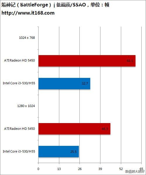 如果只是1024x768解析度低画质的话,Intel酷睿i3-530处理器内建的GMA HD显卡在《煅神记》中也可以勉强拿到超过30帧的成绩,而ATI Radeon HD 5450则甚至超过了60帧,这样的成绩还是比较能让人接受的。