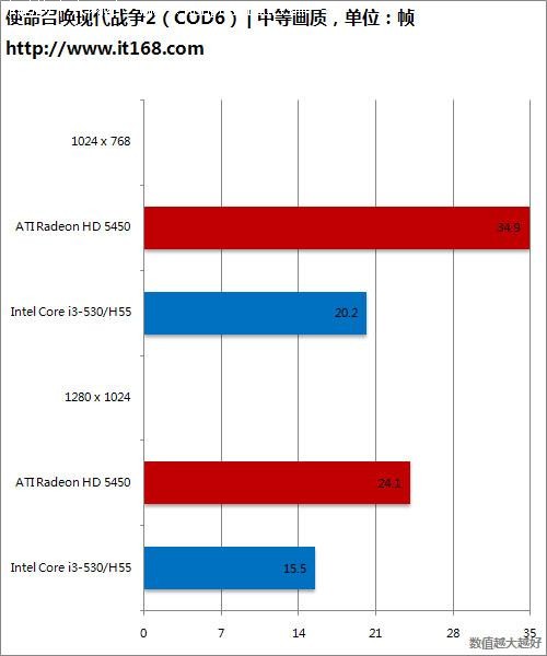 《使命召唤现代战争2》是相当热门的FPS射击游戏,不过即便是在1024x768解析度的中等画质下,ATI Radeon HD 5450也只是刚刚过了30帧的基本盘,至于Intel的GMA HD内建显卡,此时已经完全不具备可玩性。