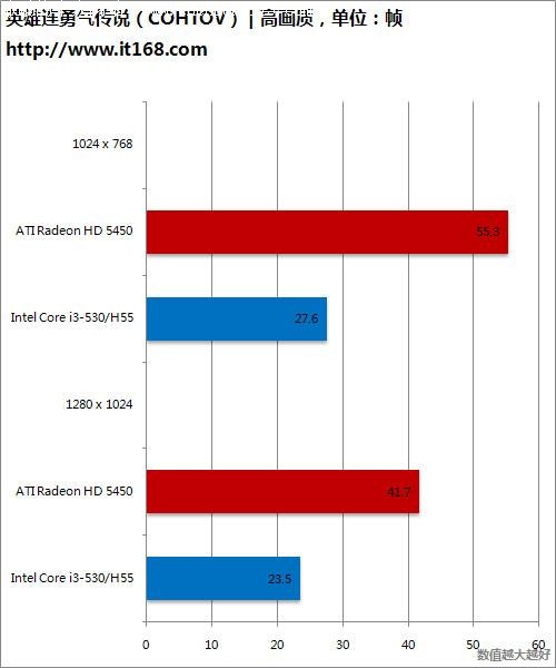 面对还算经典的《英雄连》系列,ATI Radeon HD 5450显卡1280x1024解析度高画质下超过40帧的表现对于一款即时战略游戏来说完全是可以接受的,而Intel的GMA HD就不太好了,没有什么机会过30帧的基本盘。