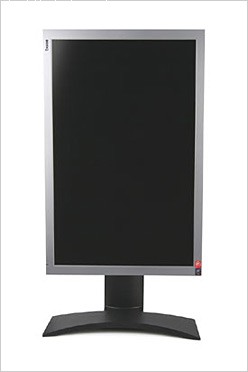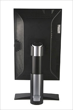 对于明基FP241W的底座,非常值得一提,可以说是目前市面上调节功能最丰富的24寸宽屏LCD底座,此底座是明基专门为专业大屏产品设计的,多功能的气压支架可以让屏幕实现全方位调节,包括高低升降调节,-5°~+25°的仰角调整,以及左右各45°的旋转调整,同时屏幕还可以90°旋转(只能作顺时针旋转)为竖向显示,其中的90°旋转功能可以为排版等特殊的工作带来极大的便利。