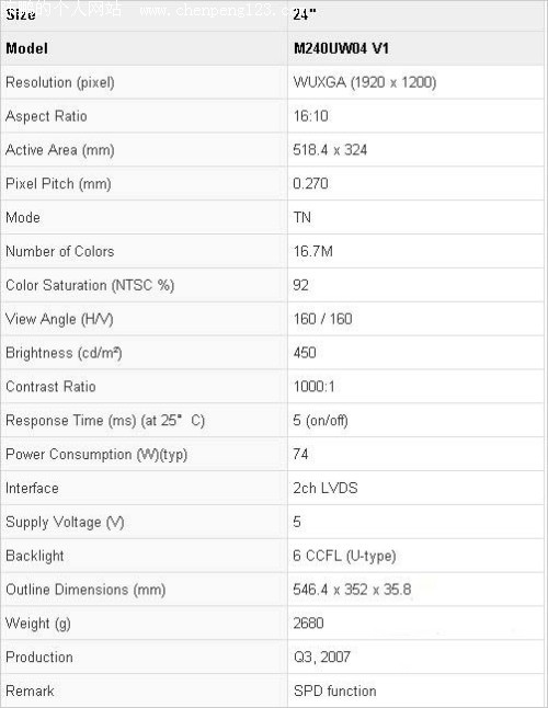 友达光电24英寸TN液晶面板M240UW04 V1规格表