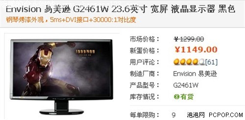 在年初G2460w以1199元的价格掀起23.6吋宽屏抢购热潮之后,易美逊在2009年6月份推出了G2460w的升级版G2461w,除了升级动态对比度、增加了触摸及触摸滑杆式按键之外,其劲爆的价格同样也让G2461w具有更高的有性价比。在本周,新蛋网以1149元的价格创造了G2461w、也是整个23.6吋宽屏市场中的最低售价,相比此前降幅达到了50元之多。