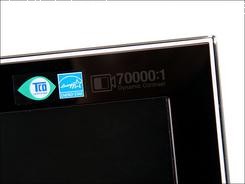 这款显示器沿用了传统的设计风格,将型号印在左上角,将产品的对比度印在右上角,另外还贴了TCO和能源之星认证标签。
