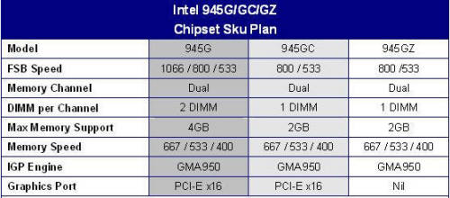 945GC芯片组将会用于Core 2 Duo入门级型号及Pentium E1000家族型号,和945GZ一样最高支持800MHz FSB外频,令它无法支持主流级1066MHz的Core 2 Duo,与965芯片组划清界线。内存规格方面,945GC虽支持Dual Channel内存技术,但由于每组内存控制器只余下1组DIMM,令其最高内存支持容量由4GB下降至2GB。但由于却拥有PCI-Express x16绘图接口,提供日后升级绘图卡之用,因此其吸引力将比945GZ更高。