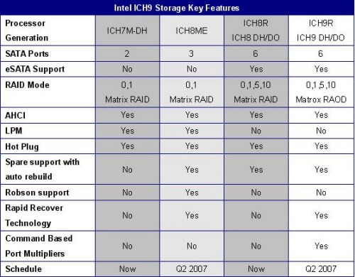 此外, Intel也将于ICH9南桥中落实支持SATA Port Multiplier技术,现时大部份南桥芯片的SATA接口,每组只能连接一个SATA装置,局限了系统的硬盘支持数目,但加入SATA Port Multiplier支持后,每一个SATA接口可让分享超过一个SATA装置分享其3Gb/s传输频宽,最高可达15个SATA装置,令系统的储存装置扩充能力被大幅提高。ICH9将于2007年第一季推出最终样本,预计于2007年第二季与新一代Bearlake芯片组家族同时上市。ICH9南桥也将分为ICH9、ICH9R、ICHDO、ICHDH四个版本,与目前的965和ICH8类似。
