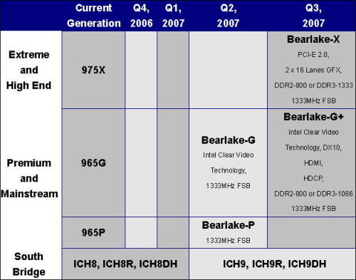 即将到来的X38 Express芯片组将取代目前的高端芯片Intel 975X Express的地位。X38 Express拥有很多新的特性,如支持PCIE 2.0、拥有两个全速PCI Express x16插槽等。支持DDR3 1333将是X38 Express的标准特性。在高端和主流市场上,唱主角的将是Intel G33、G35和P35 Express。G33 Express将整合支持英特尔清晰视频技术的显示核心,前端总线升级为1333 MHz。但是它的内存规格相对保守,只能支持DDR3-1066或DDR2-800。G33之上是G35 Express。G35 Express将整合兼容DirectX 10的显示核心并提供对高清内容回放(HDCP)的完整支持。G35的其它规格同G33一样,支持DDR3-1066和 DDR2-800,前端总线为1333 MHz。P35 Express与G35 Express唯一不同的地方在于P35 Express没有整合显示核心。X38、G33、G35和P35将与新南桥ICH9、ICH9R和ICH9DH搭配上市。此外,Intel计划2007年第三季推出取代Kenstfield、真正4核心设计的处理器Yorkfield,搭配下一代3系列芯片组,采用1333MHz FSB设计,并首次支持PCI-Express 2.0版本图形接口,首款Yorkfield型号将为针对高端玩家市场的Extreme版本,搭配高端芯片组X38,支持最高DDR3-1333内存模组。
