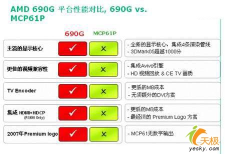 同时,为了缩减AMD 690与C51/C61的规格差距,AMD决定将AVIVO正式引入到690芯片组当中去,对于囊中羞涩而又喜爱观看高清视频的用户来说,是最好不过了。值得一提的是,AMD 690G内置的X1250也是目前全球首个支持HDMI接口的整合显示核心,配合其低发热量的特性很适合目前日益流行的HTPC应用。但是要在产品上添加HDMI接口需要主板厂商缴纳授权费用,因此会造成成本上升。因此,未来市场中销售的RS690芯片组主板可能会包含以下三种方案:第一种为干脆省略掉HDMI传输接口;第二种为附带HDMI接口但是不支持HDCP认证;最后一种为附带HDMI接口同时支持HDCP认证。就目前市面上已经上市的产品来看,采用第一种方案的AMD 690G主板占绝大部分,相信随着时间推移,将会越来越到具备HDMI接口的AMD 690G主板上市。