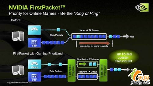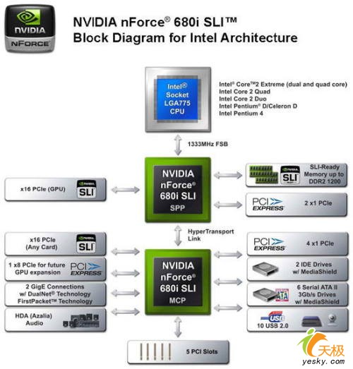 在南桥方面,我nForce 680i SLI芯片组的南桥芯片与nForce 570 SLI MCP相同,它将为Intel平台引入更多的独家新技术,例如MediaShield、FirstPacket和DualNet技术。这些都将是Intel自家芯片组产品没有的。
