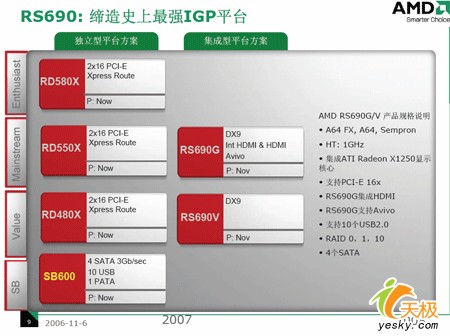不同于AMD以前的作风,这次AMD把AMD 690系列芯片组加以细分,从高到低一共发布了3款产品:AMD 690G、AMD 690V和AMD 690,这三款芯片组在整体规格基本一致,但细节的差别还是相当多的。值得注意的是,ATI最新芯片组产品规划中,出现首颗单芯片IGP产品型号为SC780,它将是RS690 + SB600的混合体,采用65奈米制程,成为ATI未来低端芯片组的主力军,但推出时间则比NVIDIA MCP61家族晚了不少,预计2007年Q3才能上市。