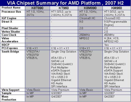 近年来,VIA在芯片组市场的动作很较,两年来几乎没有新品面市。不过,这种情况将有所改变!VIA计划于2007年下半年推出全新的AMD平台芯片组KT960和KM960,进一步加强IGP产品的性能。