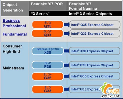 Bearlake将出现6种不同的型号,它们分别是Bearlake-Q、Bearlake-QF、Bearlake-X、 Bearlake-P、Bearlake-G+和Bearlake-G。Bearlake正式发售后将采用“3系列”命名方式。在面向商用的vPro电脑上使用的Bearlake-Q和 Bearlake-QF会被命名为Intel Q35和 Q33 Express。面向普通消费者的高端芯片组Bearlake-X和Bearlake-P将分别叫作Intel X38和P35 Express;而面向主流市场的Bearlake-G+和Bearlake-G则被称为Intel G35和G33。