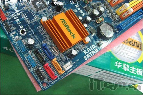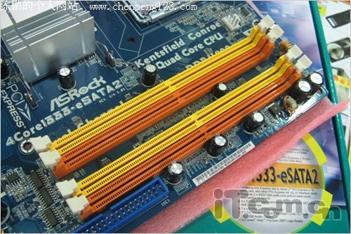 华擎4Core1333-eSATA2板载4个SATA接口,支持RAID技术,4个SATAII接口都用不同颜色来区分。扩展方面,主板提供了PCI-E X16速插槽和PCI-E X4插槽各一个,可以组建双显卡交火系统。另外主板也还有一个PCE-E X1插槽,可以插接一些声卡或者网卡设备。