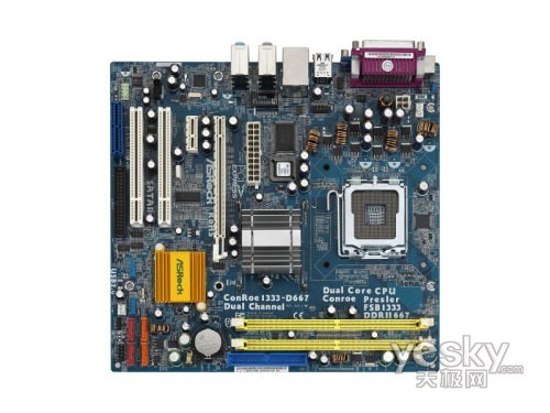 扩展方面,华擎ConRoe1333-D667 R1.0主板提供一个PCI-E 16×接口和一个PCI-E 1×接口,还提供了两个PCI接口,为用户日后的升级提供了便利。
